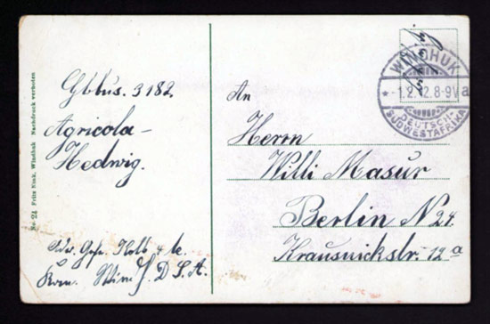 Karte wurde am 1.12.1912 in Windhuk aufgegeben. Adressat ist ein