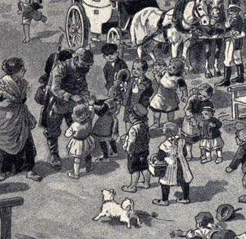 Schützlinge. Die Szenerie und der Kirchturm deuten auf